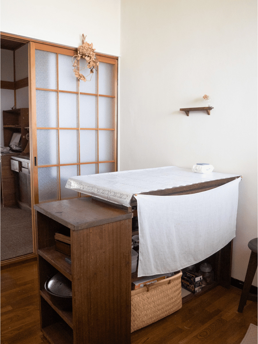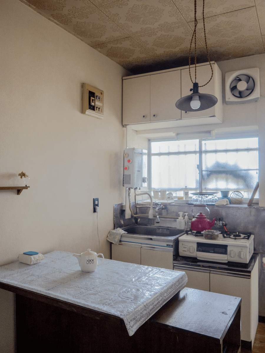 大人2~3人が調理などで作業するのにちょうど良い広さです。調理器具はシンクの下に、食器類はテーブルの下にあります。