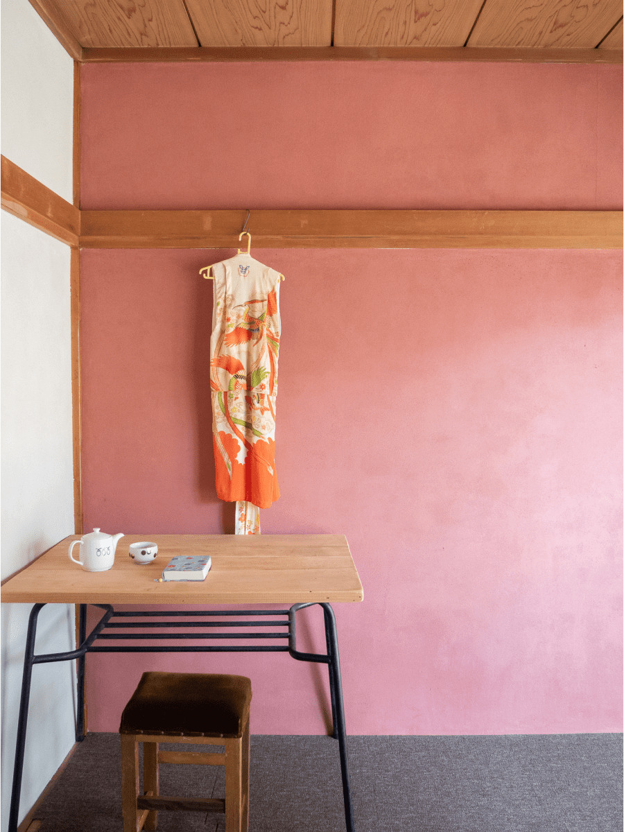 東側の壁を、濃いピンクの紅梅色に塗り上げています。