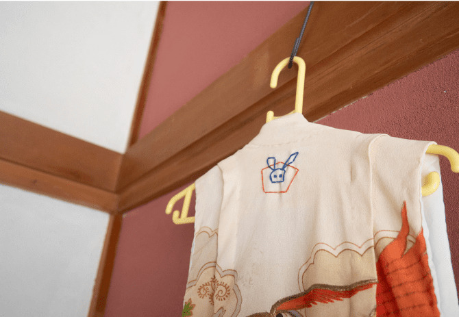 背守りが縫い付けられた子ども用の着物を譲ってもらいました。お部屋が守られるよう飾っています。