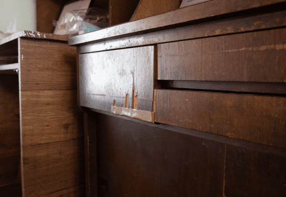 ダイニングテーブルは、レスキューした家具を組み合わせて手作りしたものです。食器棚に製図盤を載せました。